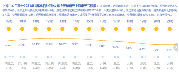 上海中心气象台2021年1月28日5点钟发布今天和明天上海市天气预报:多云转晴,明天晴到多云,今天下午以前有轻度霾。西到西北风4-5级阵风6级,今天上午转偏北风5级阵风6-7级,沿江沿海地区和江河湖面6级阵风7-8级,今天夜里转4-5级,沿江沿海地区阵风6级,明天都是东北到东风3-4级。今天最高温度10度,明天最低温度零度,局部地区有薄冰,郊区零下4度到零下2度,有冰冻或薄冰。今天相对湿度30%-85%。