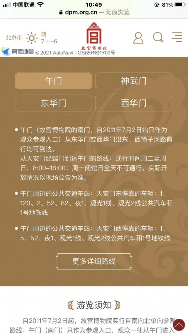 记者从海淀桥出发,手机地图上搜公交去故宫博物院,6个线路推荐都是到故宫站,也就是神武门下车。“故宫”站北边是景山公园,南边是故宫博物院的北门神武门。从“故宫”站下车就碰到因站牌名称而进不来故宫的游客。刘斌是西安人,第一次来故宫,从日坛路乘坐58路公交到终点站“故宫”站下车,哪知道这里并不能进故宫。“到了故宫,才发现这里是出口,现在要从东边围着故宫外围绕道,大概得走2公里左右才能到午门。”