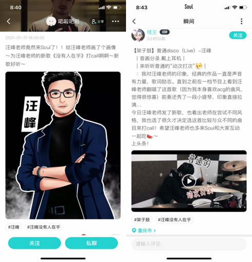 此次新歌发布,在Soul App 上反响热烈,许多歌迷朋友发表了自己的“听后感”,实时热度达到Soul 榜单第一。歌曲在Soul 上得到了广大年轻用户的喜爱,在#汪峰没有人在乎#的话题下,不仅有歌迷翻唱《我只在乎你》呼应新单曲,还有朋友为汪峰及此次专辑绘制漫画,其中也不乏音乐爱好者用自己的音乐作品为新歌打call。汪峰也空降Soul 与歌迷朋友翻牌互动,鼓励Soul 上才华横溢的用户持续为自己的热爱发声。Soul 让每个有趣灵魂都有展示自己的机会,平台上鼓励优质原创内容,诸多音乐、舞蹈、美术达人都在这个平台上展示自己的作品。