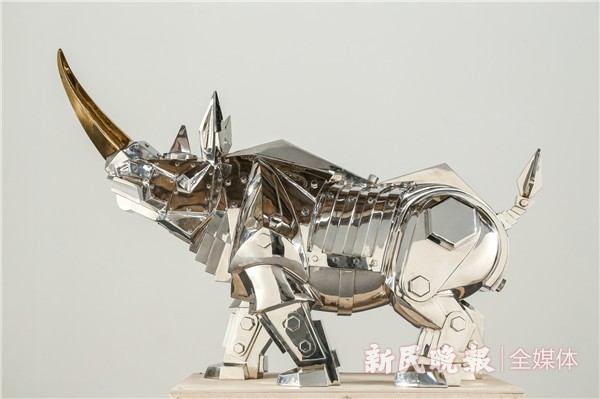 人类文化中一直存在着对犀牛的精神崇拜,犀牛被视作神兽仁犀,是代表了威武、力量和吉祥的灵兽。中国古人用“犀牛”的谐音“喜牛”来表示大吉大利。“青铜犀尊”作为尊贵的礼器,为庙堂、朝廷宫室之重宝。艺术家施力仁以大型犀牛雕塑蜚声艺术舞台。本次“奔向胜利”展,他的30件犀牛雕塑由彩钢、不锈钢、铜雕、高温瓷等不同材质铸成,艺术家对犀牛进行了机械化和几何形体化的塑造以及人格化的提升,呈现出勇敢、坚强、吉祥、活力、憨厚、多福、责任、关爱、俏皮等多样化的人类精神投射和内心寄望,赋予犀牛“奔向胜利”的精神意义,在今天,犀牛雕塑更隐喻了人类不断进取、战胜疫情的强大精神勇气。30头犀牛从北京运抵上海后,被精心展示在上海国际贵都大饭店一楼、二楼和27楼艺术长廊等公共空间。