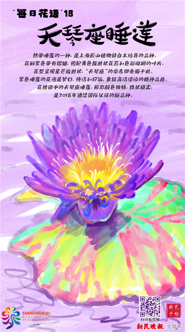 热带睡莲的一种,是上海辰山植物园自主培育的品种。花瓣紫色带有褶皱,搭配黄色散射状花蕊和色彩斑斓的叶片,花型呈现星芒放射状,“天琴座”的命名即来源于此。