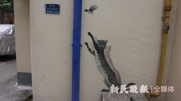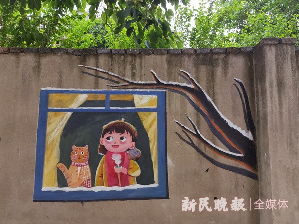 近日,上海市长宁区武夷路52弄旧貌换新颜——活泼、生动的墙绘为老弄堂增添了别样的色彩。富有艺术气息的墙绘吸引周围居民前来拍照打卡,老弄堂有了新看头。武夷路52弄这些墙绘的整体风格现代、活泼,生活气息浓郁。墙上,猫咪或肆意打闹、或眯眼小憩;笼中的金丝雀、鹦鹉栩栩如生;布满墙头的爬山虎一片绿意……与这些平面卡通画相比,裸眼3D墙绘更为惹眼:原野上的长颈鹿将脖子伸出了画框;可爱的猎犬瞪大眼睛;胖胖的加菲猫手持画板,仿佛和路人顽皮互动……
