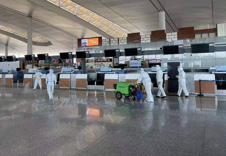 工作人员在南京禄口机场T2航站楼内进行消杀。新华社发