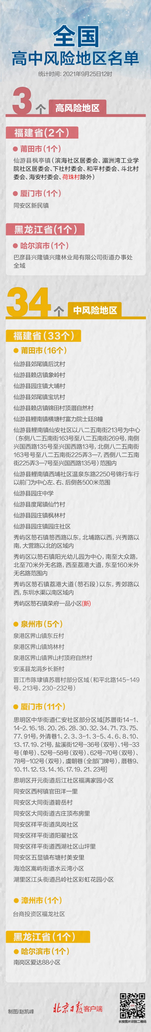 目前,全国现有高中风险地区3+34个,涉及黑龙江、福建两省。