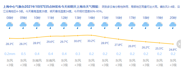 今天是国庆长假的最后一天,上海阴到多云有分散性阵雨,局部地区雨量可达大雨。偏东风3-4级,沿江沿海地区4-5级。今天最高温度29度,明天最低温度24度。今天相对湿度60%-95%。