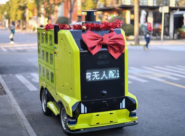 图说:智慧湾行驶的无人配送车 陈梦泽 摄