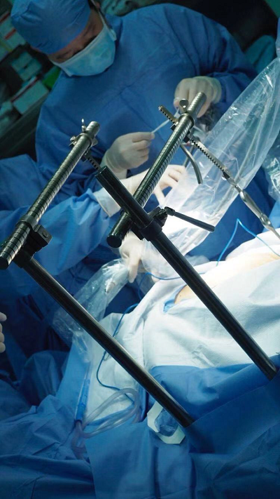 一开始只是想从国外“拿来”用一下,但是联系了国外的生产厂家后发现,器械并未批量生产。于是范江尝试着联系各种国内医疗器械厂,想自己把双拉钩这个器械做出来。“到底是怎么拉上去的?我想了好多办法,或是用钢丝拉上去,或是用铰链拽上去,有的设计过于复杂,甚至不像手术器械……经过无数次尝试,我们最终选择了一个骨科常用的器械,把它竖起来和拉钩结合在一起,总算做出了样子。前前后后折腾了七八个月,终于在2016年把它应用于手术。”