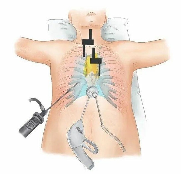 比如,重症肌无力是一种神经肌肉接头处传递功能障碍所引起的自身免疫性疾病,临床主要表现部分或全身骨骼肌无力和易疲劳(眼皮下垂、视力模糊、复视、斜视、哭笑容等),症状严重会使呼吸机无力,导致呼吸困难,甚至危及生命。肌无力患者中有65%-80%有胸腺增生,10%-20%伴有胸腺瘤。伴有重症肌无力的胸腺瘤所要求的手术方式最为复杂,其中手术入路选择是业内争论的焦点。不过,“剑突下双拉钩全胸腺切除术”问世后,这一难题也有了新的思路。