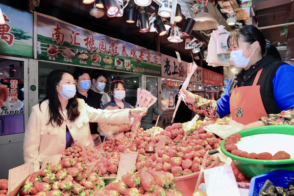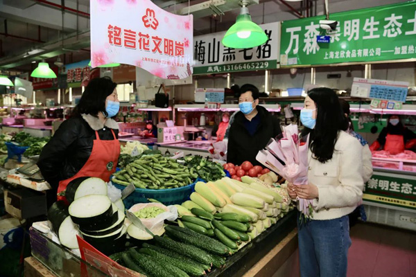 在国际三八妇女节到来之际,铭言集团副总经理、妇联主席高硕等公司领导向嘉陵菜市场的女性摊主们献上康乃馨,向她们致以三八节的祝福。同时,集团下属二十余菜市场的百余名女同胞也在节日期间收到了公司妇联的节日祝福和慰问。