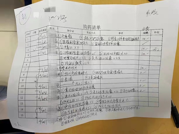 两人不是患者,而是区级机关的中共党员,封控期间下沉社区,身上的绿马甲表明了身份——闵行区梅陇镇社区志愿者。这59张医保卡来自封控区的居民,由梅陇二居负责统计登记好用药需求,两人带来华山医院,集中为社区居民配药。摊开四张用黑色水笔写满字的A4纸,上面详细罗列了药名和数量,赵宁说,有阿斯匹林、开塞露,还有需要冷链运送的胰岛素等,大多数都是一些常见病慢性病的药物。