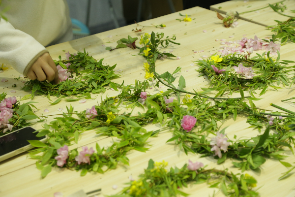 图说:大学生们自己动手编织花环