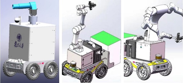 20余名研究生在联合科研团队的支持下,迎难而上,高效开发。他们分了三种机器人的 “小分队群”,每个群里都有课题组的一位博士生、几位硕士生以及外部协同技术人员。4月下旬,移动喷洒消毒机器人、面向外卖的紫外消毒机器人和少自由度移动消杀机器人悉数亮相,它们分别投入道路、室内及外来物品的消杀工作。