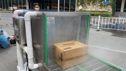“在符合消毒技术规范的基础上,安全高效、快速落地是我们本次研发的核心要点。”张天资介绍,“考虑到物资大多是纸箱包装,如果直接喷洒消毒水,容易打湿包装且非常浪费,我们采用了超声雾化的方案。消毒液被雾化成10微米左右的颗粒,可以很好地附着在物体表面,当物品离开消毒仓之后消毒剂还能继续起作用,不仅提高消毒效率还保障了效果可靠。”
