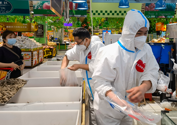 图说:工作人员正在水产货架前打包