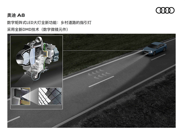 奥迪始终将驾乘安全与客户满意放在首位,这是四环品牌取得成功不可或缺的要素。而日益重要的照明技术,也在朝着这一目标持续发展,为用户带来更多可能,让驾驶更安全、交互更畅通、灯光更个性。在全新的奥迪A8中,奥迪已经通过系统性的数字化照明实现了这一切:前瞻性的数字矩阵式LED大灯、数字OLED尾灯将客户体验提升至全新境界。全新奥迪A8也是奥迪首款实现全面数字化照明的车型,其配置的数字OLED尾灯能满足用户更多个性化需求,数字矩阵式LED大灯则提供两大全新功能,高速公路带方向指示灯的车道灯,以及乡村道路的指引灯。先进的照明技术不仅彰显了奥迪“突破科技 启迪未来”的品牌精神,更将为用户创造更多价值。