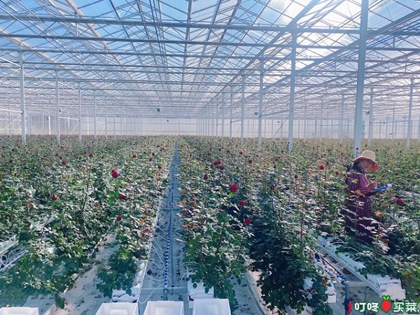 图说:叮咚买菜工作人员在大棚内采摘鲜花