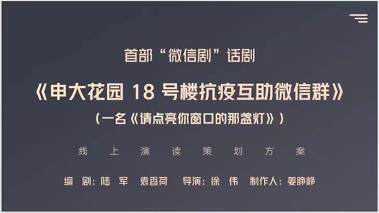 同舟共济,以艺战疫。疫情期间,人文松江创作研究院创作不停,以疫情防控为主题的戏剧创作也正在加紧出炉。由上海戏剧学院教授陆军和编剧袁香荷共同创作的首部微信剧《申大花园18号楼抗疫互助微信群》(一名《请点亮你窗口的那盏灯》)线上演读正在紧张筹备中,将于6月初与观众见面。