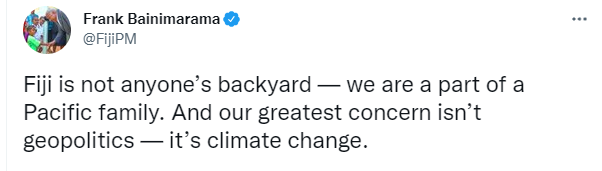 5月28日,刚刚上任才几天的澳大利亚外长访问斐济之际,斐济总理弗兰克·拜尼马拉马在推特上写道,“斐济不是任何人的后院——我们是太平洋大家庭的一份子”,“我们最关心的不是地缘政治,而是气候变化”。这应当是太平洋岛国人民对西方国家在该地区地缘竞争的一种回应。