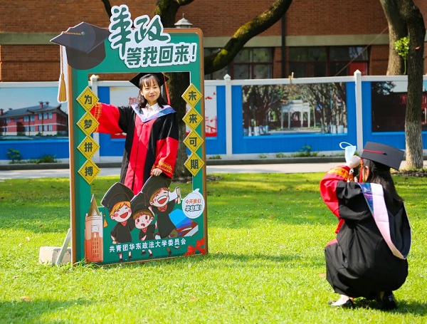 毕业典礼设学校主会场和学院分会场。主会场以线上方式开展,分会场由各学院在符合防疫要求的前提下于15日和16日,以“线上+线下”方式在长宁校区图书馆前小草坪,松江校区富田体育馆、集英楼、明实楼广场开展。