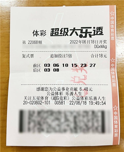 他说:“上海封控了两个多月,这段时间里无法购彩,但恰逢体彩正在进行15周年的大派奖,总觉得有点遗憾。经历了此次疫情后,我更觉得该珍惜每一天,多做公益,乐观生活。6月18日开奖前10分钟,我让店里的销售员随机按了一注大乐透‘6+2’复式追加票,我看了一眼前区六个数字,从小到大分布均匀,四奇二偶,我比较中意,所以没有改动前区,就把后区的两个号,改成了自己喜欢的‘03’、‘08’,想着今天日子是6月18号,买个‘6+2’追加,单票金额又是18元,希望讨个好口彩。买完后我就一直留在彩票店里等待大乐透开奖,所以店里的人都见证了我的中奖。很幸运我赶上了体彩大派奖的末班车,以后‘18’就是我的幸运号了。”(雯彬)