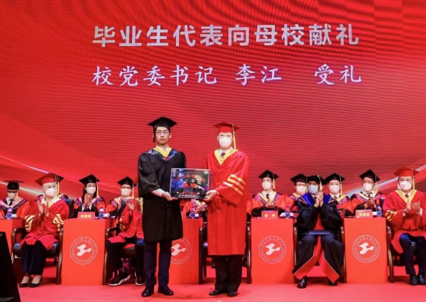 在毕业典礼上,上海工程技术大学党委李江书记代表学校收到了一份珍贵的毕业礼物——来自机械与汽车工程学院木鸢机甲战队精心制作的英雄机甲战车模型,饱含了2022届毕业生对母校的深情厚谊。