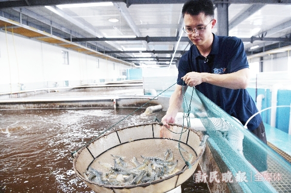 图说:陈伟在基地内检查虾的成长情况 新民晚报记者 徐程 摄