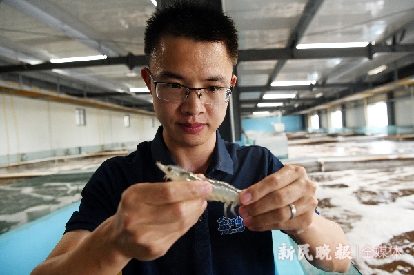 4年前硕士毕业于上海海洋大学水产与生命学院的陈伟是基地养虾团队的一员。走在基地生产车间,他弯腰将“越狱者”们放回池中。