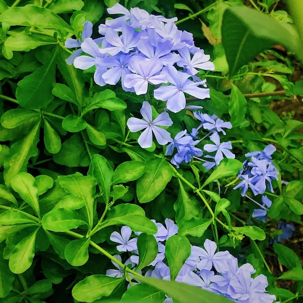除了紫薇,迎着高温绽放的花还有不少。比如蓝紫色系的就有蓝雪花和蓝花草,蓝雪花被形容为“清纯色胜枝头雪,娇小花融梦里蓝”,是白花丹科蓝雪花属多年生草本植物,也是我国特产。它的颜色清凉,观赏期长,养护简单,目前在上海植物园植物大楼广场、三号门花坛花境处开得正艳。蓝花草叶似柳,茎如竹,原产于墨西哥,耐高温,易养不娇气,因每天都会开出新的花朵,也叫“日日新”,在杨浦区街头常见。