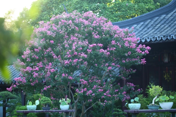 在古猗园里,紫薇花就不惧烈日,开得极为茂盛。紫薇的花瓣极为褶皱细碎,花朵伴随着微风翩翩起舞,摇摇曳曳,淡淡花香随风轻送,暑热也似乎跟着消失了。此外,在环城绿带的各个防护绿地里,也有紫薇迎着酷暑绽放。绿带里的紫薇一般高度都超过2米,树干粗壮而高大,满树垂花,又如一株株彩色“树灯”。在新改建的绿带中,还会栽种更具观赏性的矮生紫薇,也颇有观赏价值。