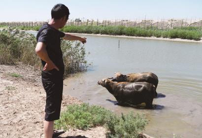 养殖基地附近的一条小河,水面上探出3个小脑袋,见到有人靠近,纷纷从河里爬上岸。它们是3头牛角还未成形的牛宝宝。“这3头小牛只有4个月大,它们的妈妈就在附近。”茅师傅走向小牛犊,但它们却不靠近,反而向附近另一条小河走去,还时不时回头看看,似乎在试图带路。