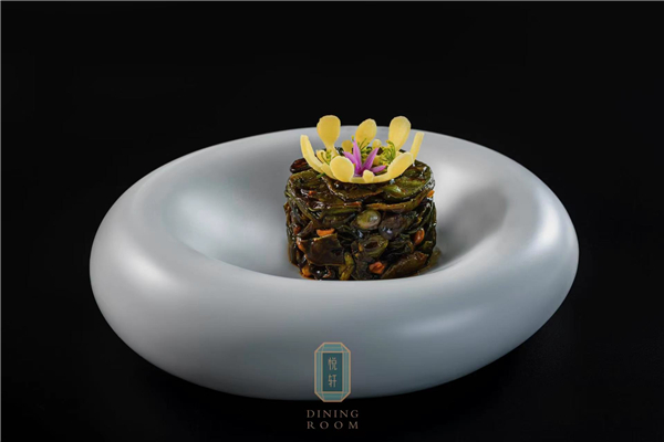 一道糟香酥骨黄鱼冻,杨师傅结合了他北方的身份与南方的厨艺,呈现得芬芳华丽,宛如琥珀。杨师傅讲给我听,这道菜,是他疫情期间,在家里闭门不出、苦思得来的灵感。在家试做的时候,是拿小黄鱼治,炖数个小时,放多一些鱼皮下去一起炖,鱼皮的胶原蛋白久炖之后融化于鱼汤里,仔细将鱼汤过滤干净,略经冷冻,就凝结成一块琥珀,而酥骨黄鱼,封冻于琥珀内,如化石一般清雅高古,美极了。至于鱼的滋味,糟香馥郁,回味绵长,很动人。