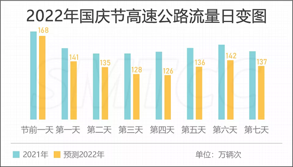 上海交通指挥中心发布的国庆假期出行预测信息显示,高速公路网车流规模总量将达945万辆次,日均流量135万辆次,同比下降约12%,较2022年中秋节上升约5%。若遇到不良天气或突发疫情状况,则高速公路车流规模将降至910万辆次(日均130万辆次)。