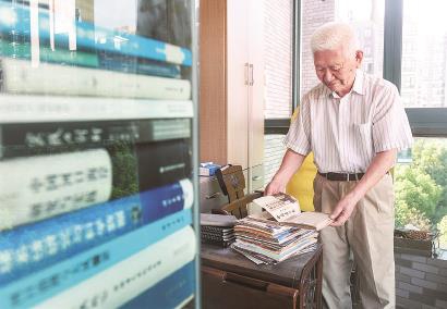 图说:沈焕庭教授喜欢剪贴报,家中已有好几本贴报本 新民晚报记者 陶磊 摄