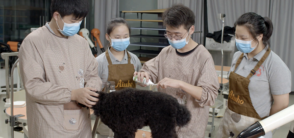 图说:学生在贵宾犬上进行宠物美容实践