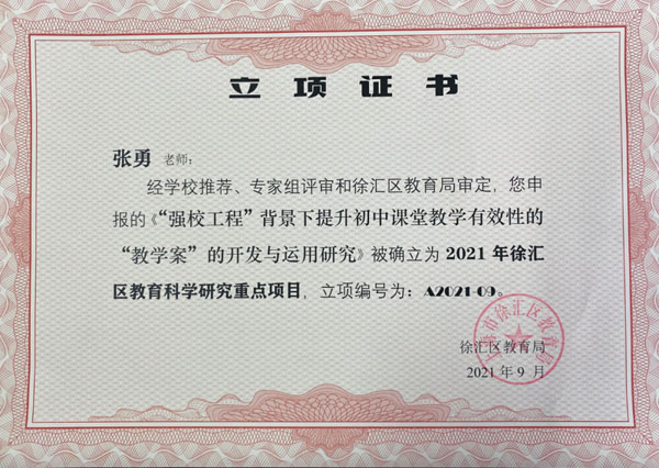 同年,学校申报的区级重点课题《强校工程背景下提升初中课堂教学有效性的教学案的开发与运用研究》立项。自此,在长桥中学的课堂上,“教学案”成为重要抓手,提高了课堂教学有效性。