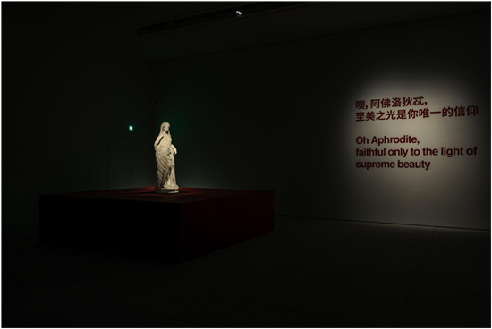 值得关注的是,在MAP开馆大展“蔡国强:远行与归来”中曾展出的雕塑作品《玫红维纳斯》的灵感原型——那不勒斯国家考古博物馆镇馆之宝《维纳斯的背影》,这次也随展览来到上海。由大理石制成的维纳斯雕像与黑色的《手持西塔拉琴的阿波罗》雕像被并置于同一展厅。二者在颜色、型态与寓意上形成对比,充分体现了古罗马时期西方文化中男性与女性的两种理想形象。