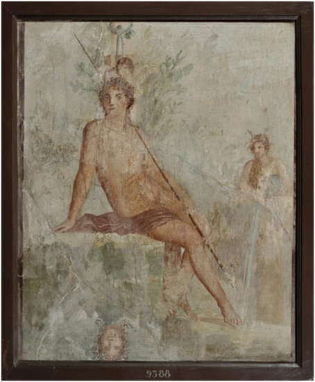 “爱与美”的第一部分以两座人物特征和型态各不相同的大理石雕像为起点,两座雕像都表现了希腊神话中“爱与美的女神”阿佛洛狄忒,即罗马人口中的维纳斯。第二部分向观众呈现了更多神话角色的雕塑,包括光明女神黛安娜、智慧女神雅典娜等。展览中,众神之首宙斯并没有以本体的形式直接出现。但来自公元1世纪庞贝的壁画《勒达与天鹅》讲述了宙斯爱上斯巴达王后勒达,并化作天鹅向她求爱的故事。此处隐藏的“彩蛋”间接向观众发出进一步走入神话故事世界的邀请。