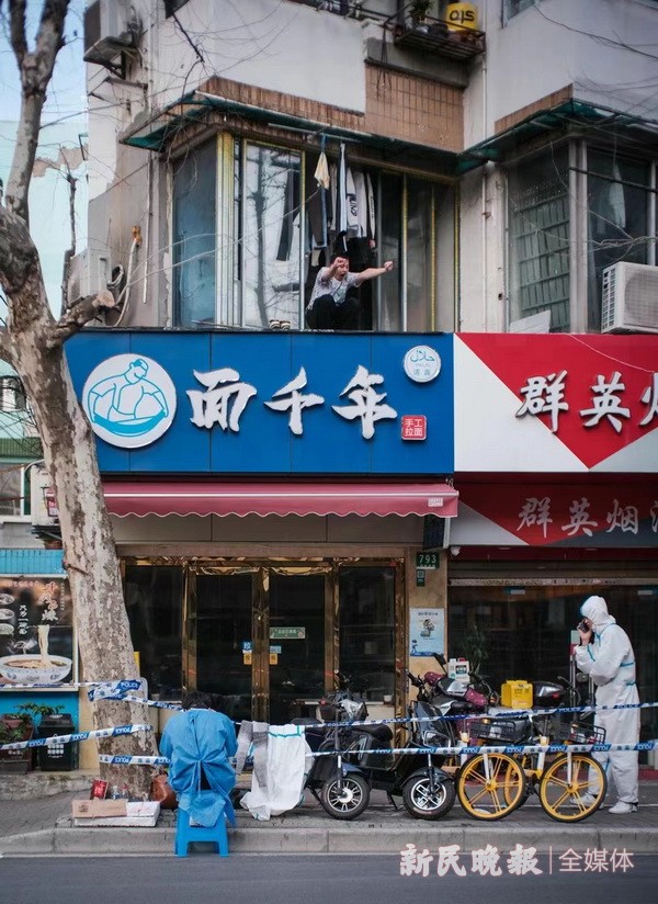 2022年3月15日,黄陂南路,封控中的男子站在窗台上伸了个懒腰。