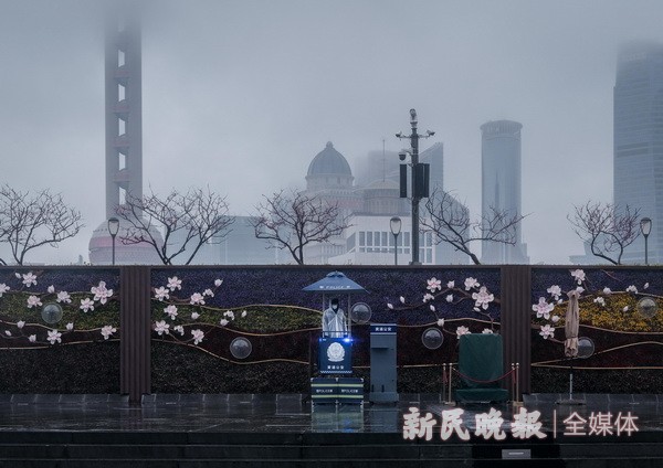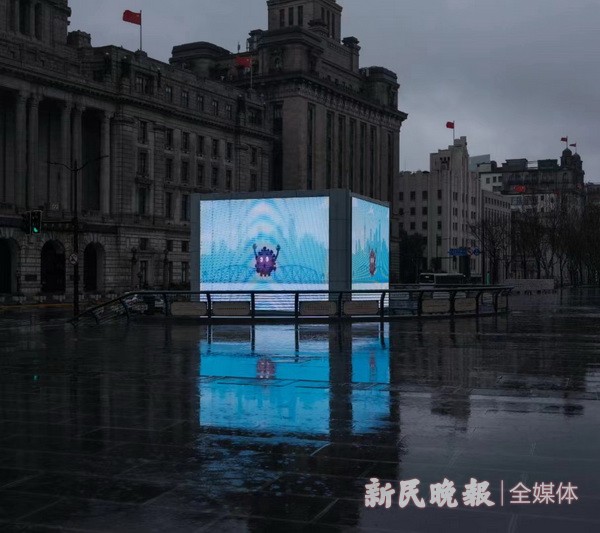 2022年3月21日,外滩几乎没有游客,大屏上滚动播放抗疫宣传视频。