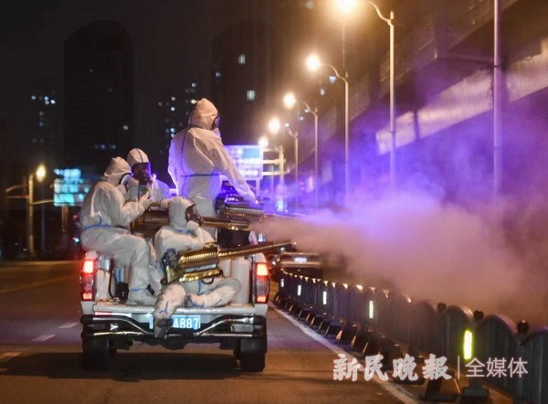 2022年3月22日,徐汇区,身着防护服的工作人员正在沿路消杀。