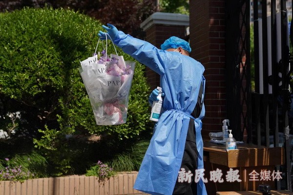 2022年5月8日,母亲节,防疫人员对一捧鲜花消毒。