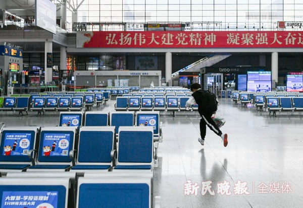 2022年5月16日,上海虹桥站出发列车增加,一位旅客奔向检票口。