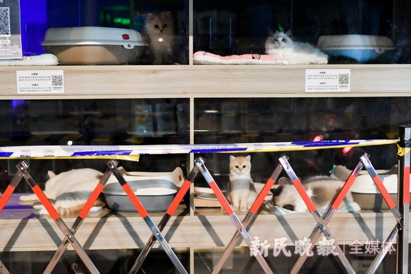 2022年5月17日,威海路上一家宠物店,一只猫对偶尔出现的路人十分好奇。