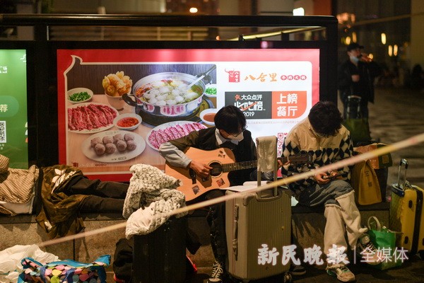 2022年5月20日,东方路潍坊路公交枢纽,两个年轻人拿着吉他和行李,等待第二天前往虹桥火车站的公交车。