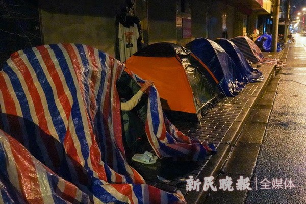 2022年5月28日,大雨如注,一名安保在他的帐篷外加盖了一层彩条布,白天他管理封闭小区,晚上便回到帐篷休息。