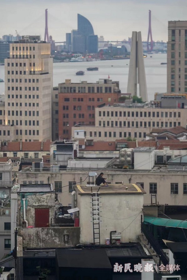 2022年5月30日,一名男子来到医院屋顶,脱下口罩刷起了手机。