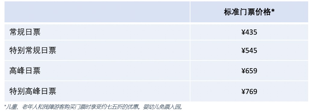 “常规日”门票价格为475元人民币,涵盖大部分平日和部分周末;