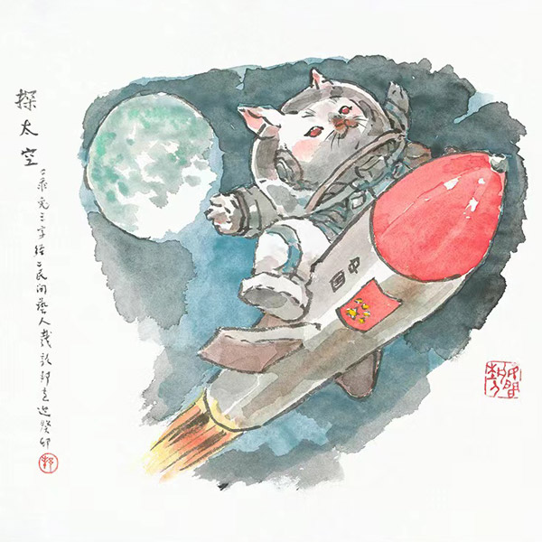 在这套匠心独运的画作中,戴先生将兔子的形象拟人化、时代化、趣味化,从一飞冲天、登月圆梦的航天兔,到手拿笔记本,认真学习博物馆中周秦汉唐历史文物的好学兔,还有身穿军装,戴大红花的参军兔,以及写好中国毛笔字的学书兔……无不是年过八旬的先生对新时代,新气象的描绘、表现与赞美。