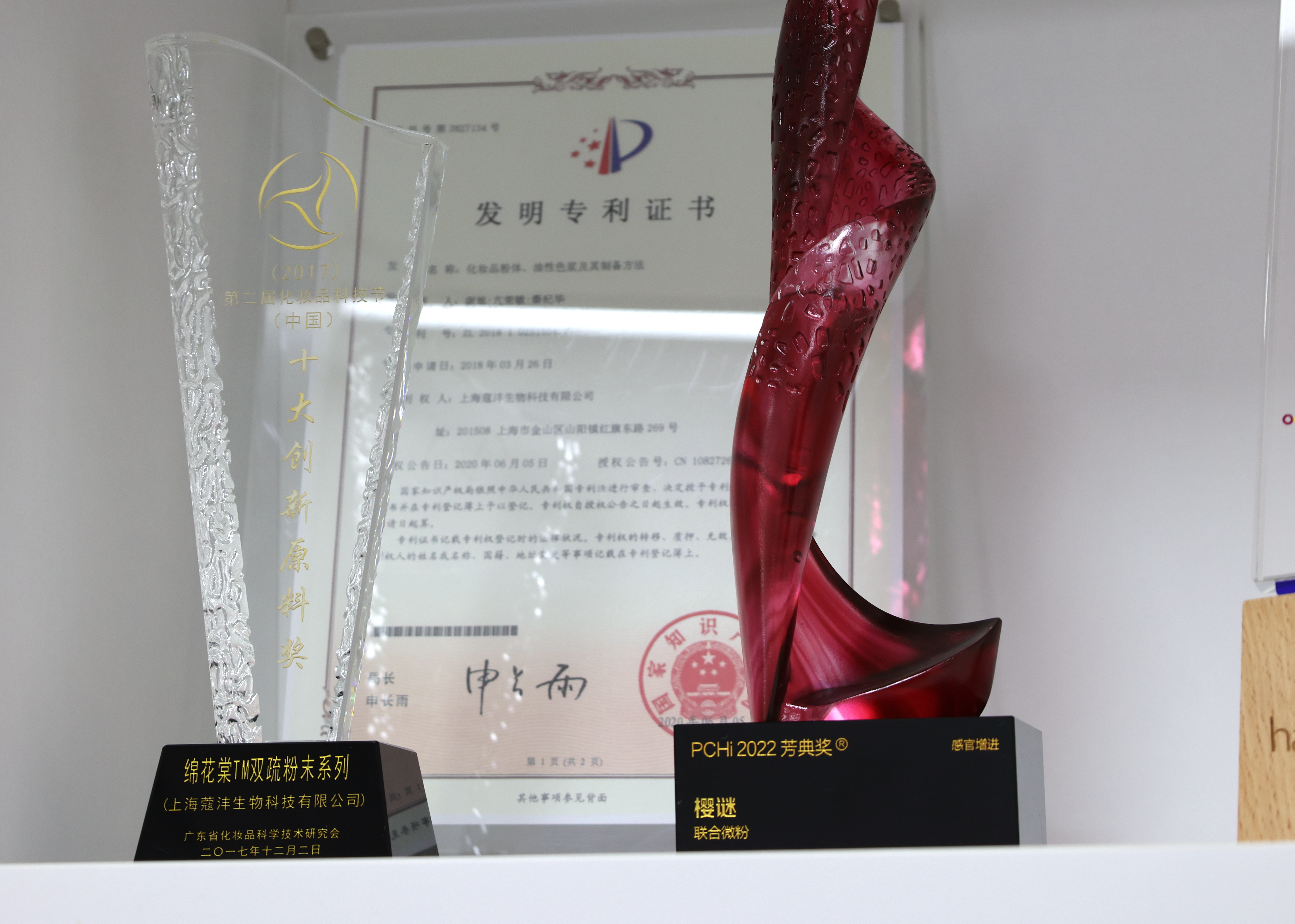 蒲科深知,粉之道,贵以专。一个品牌,想要拥有优异的彩妆“品质”,优质原料是核心。经过十多年的潜心研发,公司实现了3次跨越式大发展——2014-2016年,荣获全球首家“零色差”核心专利,成为国内首批以ISO、GMPC 体系标准生产粉体原料的企业;2017-2018年,公司打破国际高端粉体原料垄断,研发生产了中国人自己的高端粉体原料,获批3项原料和生产技术发明专利,并开启了全球业务布局;2021-2022年,公司樱谜系列产品冲出全球91家企业的152个作品,荣获行业内具有相当影响力与权威性的PCHi2022“芳典奖”(2022感官增进奖)。同时,相关产品两次荣获荣格技术创新奖。