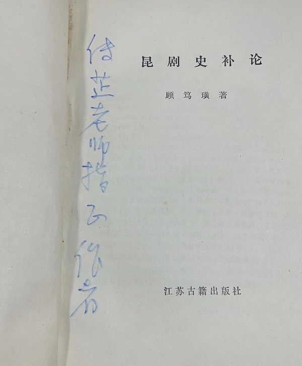 去岁,笔者有幸得到一本顾笃璜所著《昆剧史补论》,上书“传芷老师指正 作者”。正是顾笃璜签赠给沈传芷的签赠本。如今,二位前辈均已过世,借此签赠本以钩沉二人关于昆曲的过往,以为纪念。